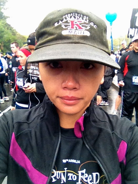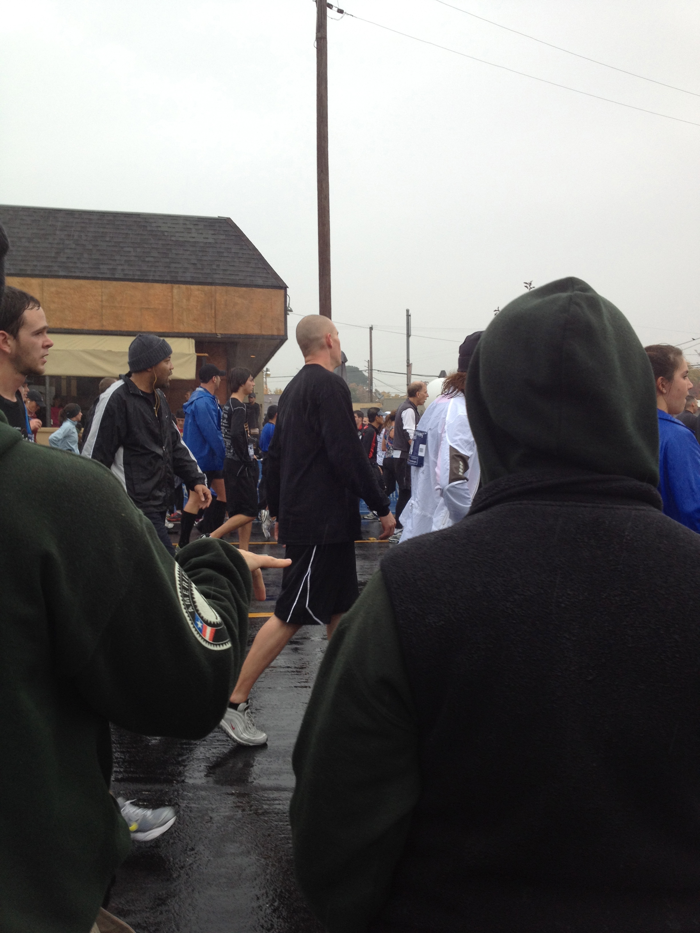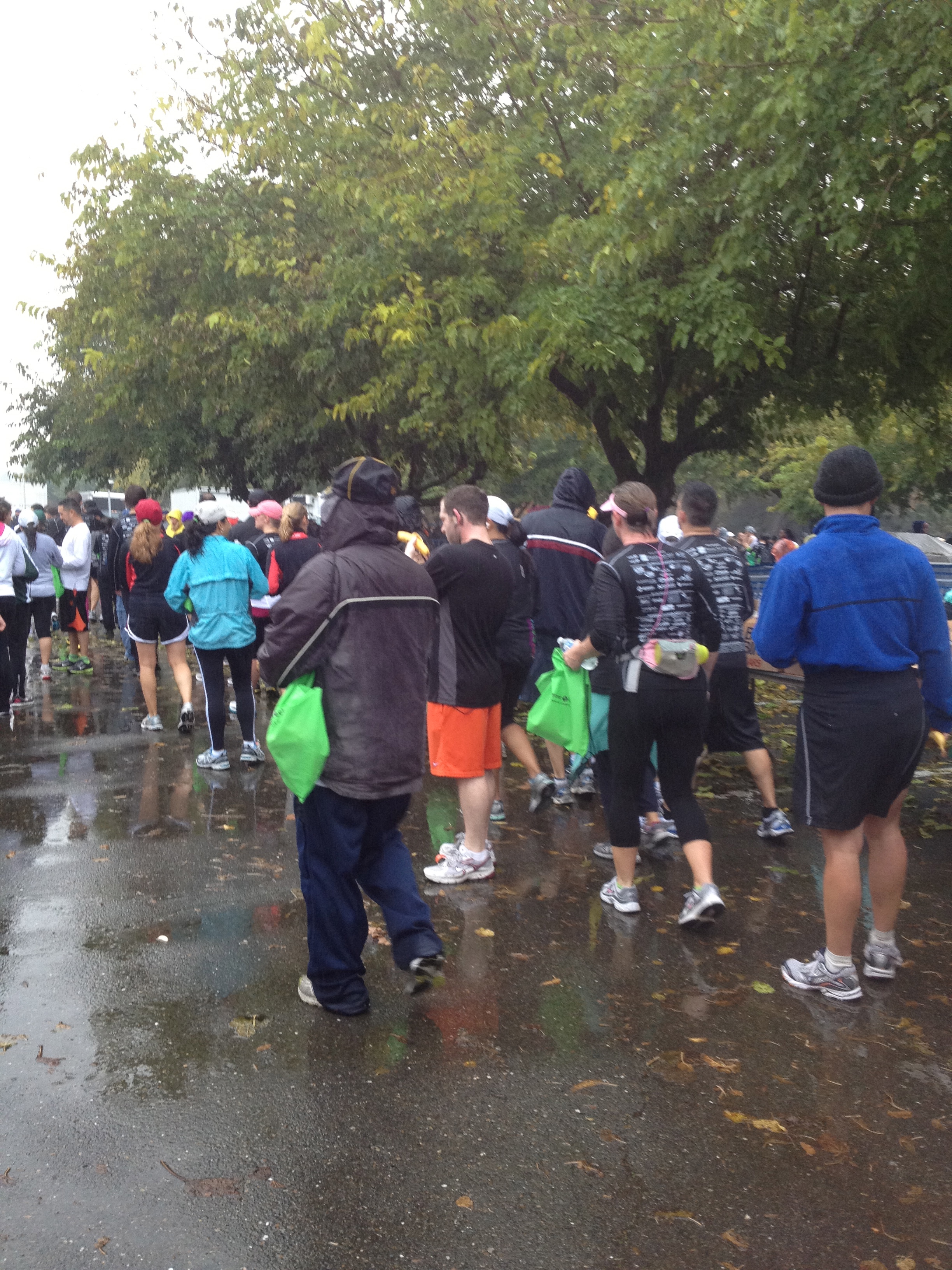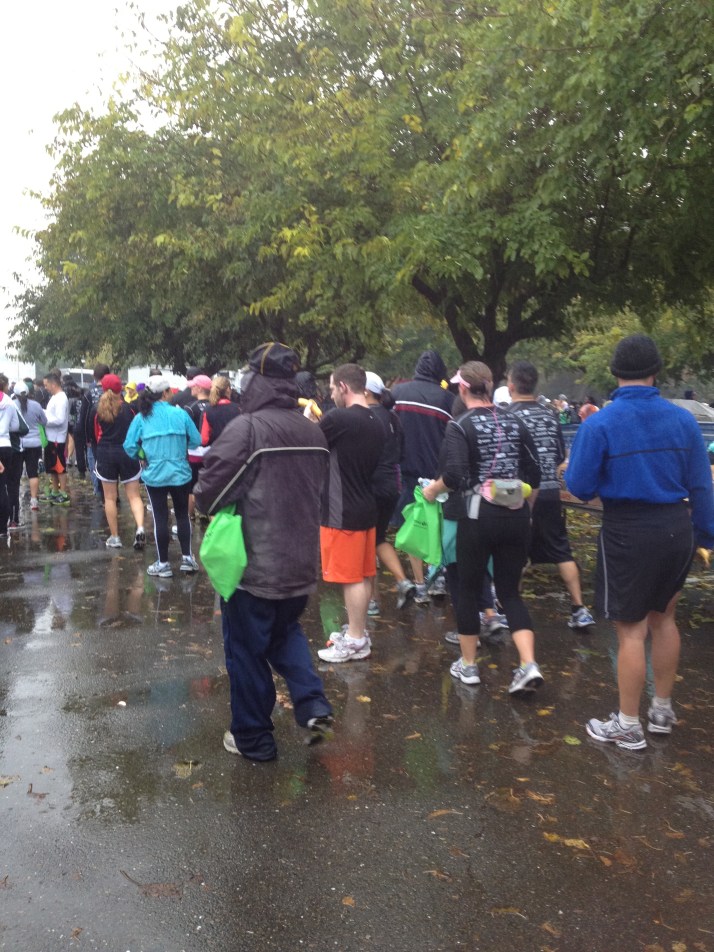 I had a Luna bar and Zico for breakfast and was glad that the coffee shop had clean bathrooms to use :-) I really didn’t want to use the porter potties by the start line :-/ I was getting a little anxious. It was a big race and it was raining. I was really worried about slipping and falling. I was worried about not reaching my goal. I’m not a super serious race person but I trained hard and I really wanted all my hard work to pay off. There were two types of bibs handed out – one for those that were being timed and one for those not being timed. I had to pay extra to be timed.