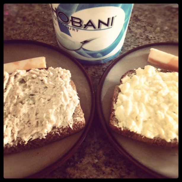 M3 – Egg Salad and Tuna Salad on top of Whole Wheat Bagel Thins w/ spinach. Used plain Chobani greek yogurt to make the salads. The boys love these salads and I’m so glad that I can make it with greek yogurt instead of mayo.