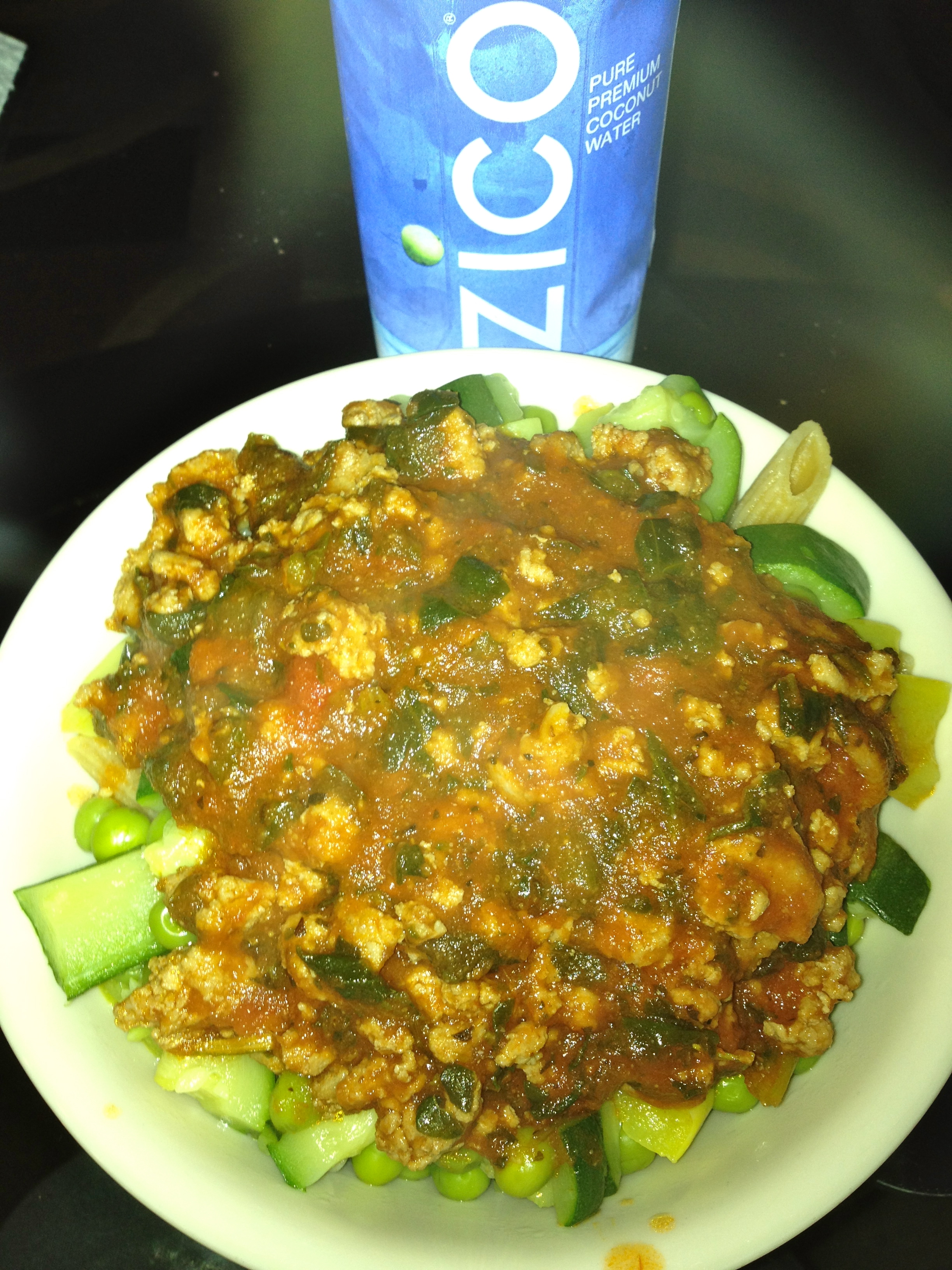 M5 – Whole Wheat pasta with a turkey spinach red sauce with peas, squash and zucchini.