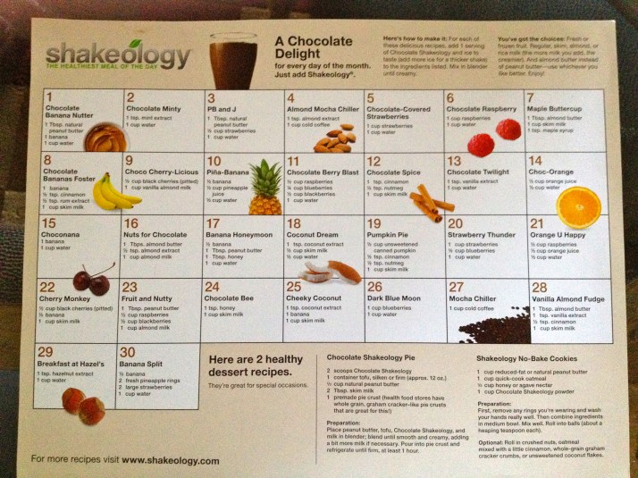 Well I made it through the Shakeology Cleanse :-) I have to say that for a cleanse – this was probably one of the easiest. I didn’t expect it to be. How could 3 shakes, two cups of green tea and two servings of fruit (which are optional) going to keep me full? The answer: Shaekology! These shakes will fill you up just with the water and ice. I was allowed to add fruit to my morning shake, and that made it even more filling. They have a whole bunch of recipes they suggest and I’m sure those make it more satisfying :-)