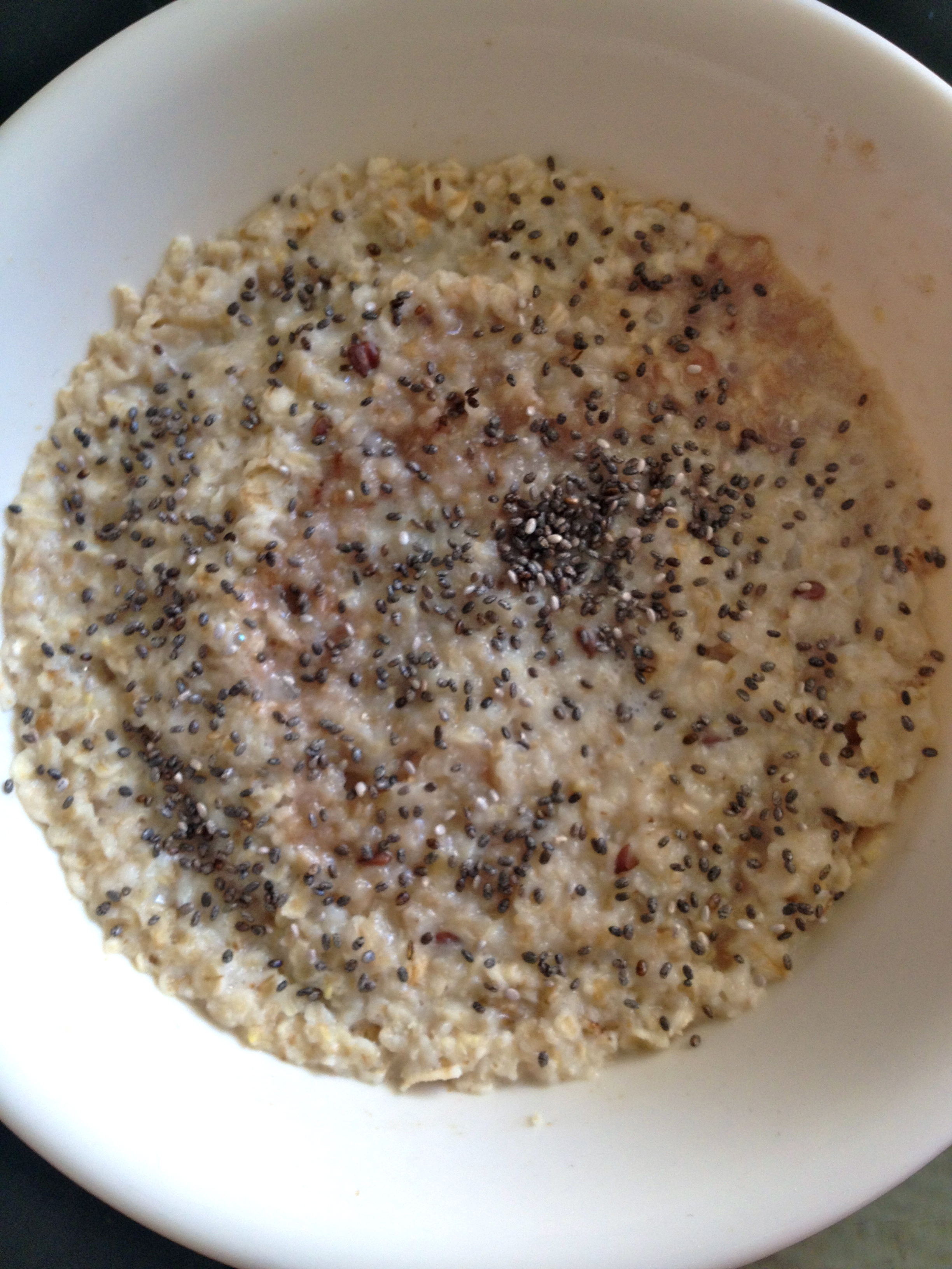 M1: Flax Plus Oatmeal with chia seeds, unsweetened vanilla almond milk, and just a tad bit of cocoa almond butter.