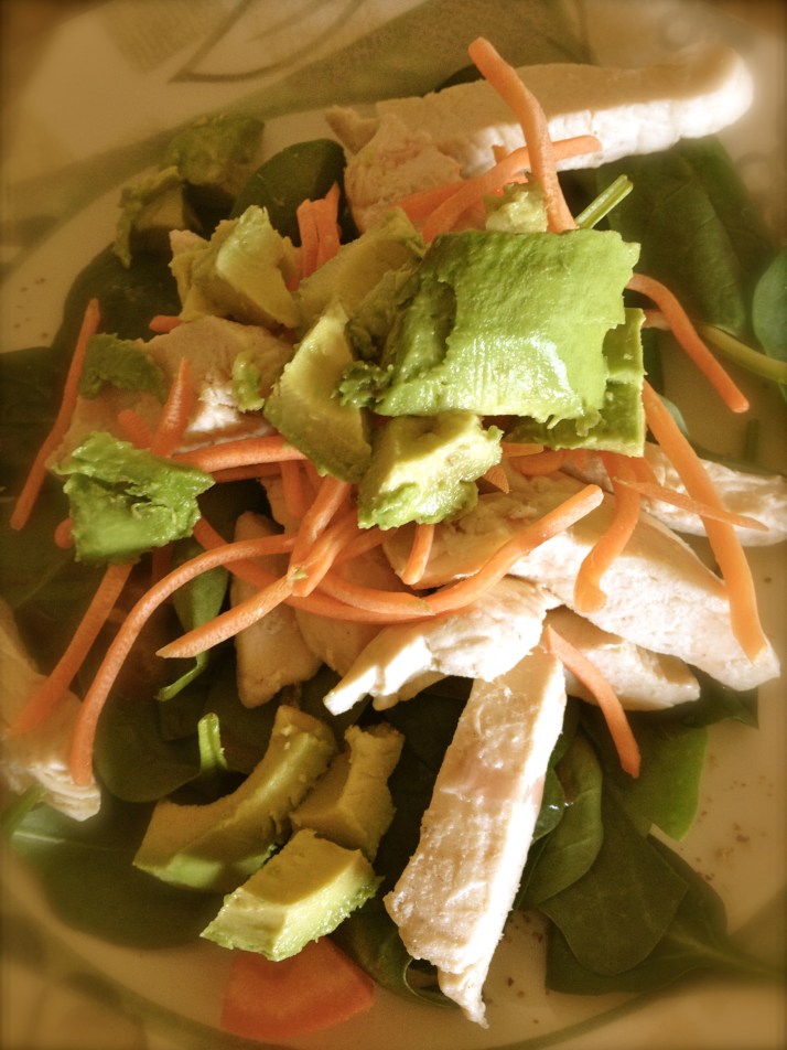 Lunch - Panko Tilapia Spinach, carrots, tomatoes, avocado, and cucumber salad